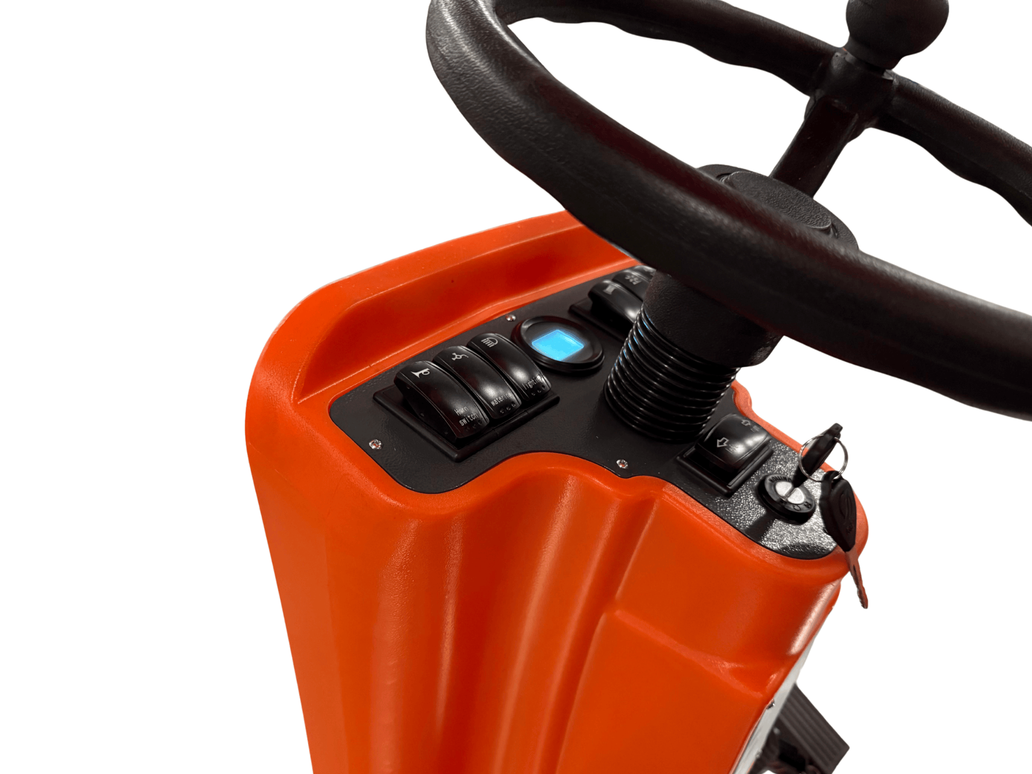 Mit einer Ladezeit von 6–8 Stunden erreicht die KM160-PRO eine Arbeitszeit von über 5 Stunden. Das Schutzdach bietet zusätzlichen Komfort bei Einsätzen im Außenbereich – ideal bei Sonne oder leichtem Niederschlag.
