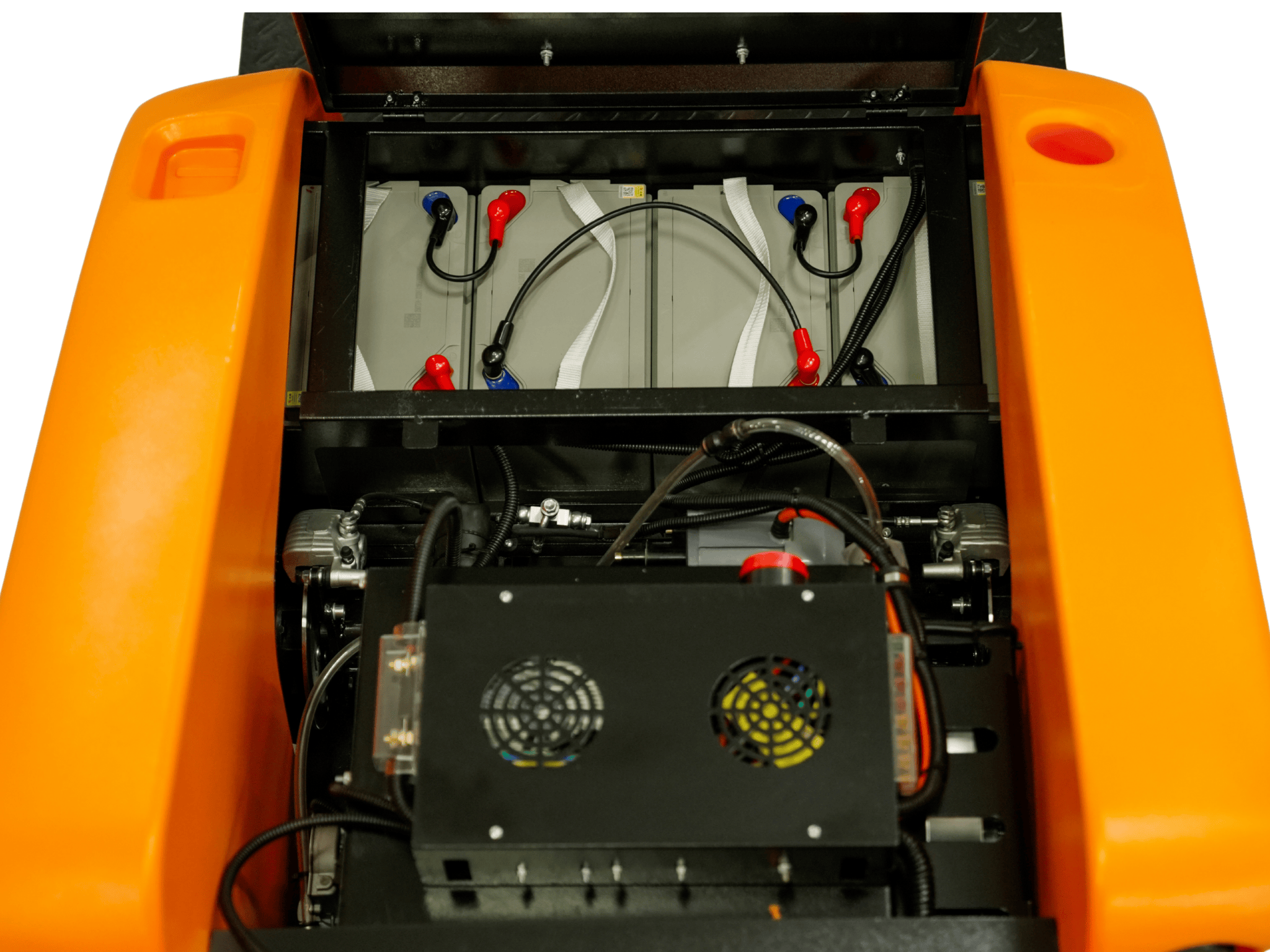 Varustatud a 1000 W ajamimootor, a 700 W peaharja mootor, kaks 90W külgharja mootorid samuti a 216 W imemismootor Masin avaldab muljet oma suure töökindluse ja tugeva puhastustulemusega. Suur 80-liitrine veepaak tagab optimaalse tolmu sidumise, samas kui mahukas 120-liitrine prügikonteiner Võimalik on pikk tööaeg ilma tühjendamiseta.