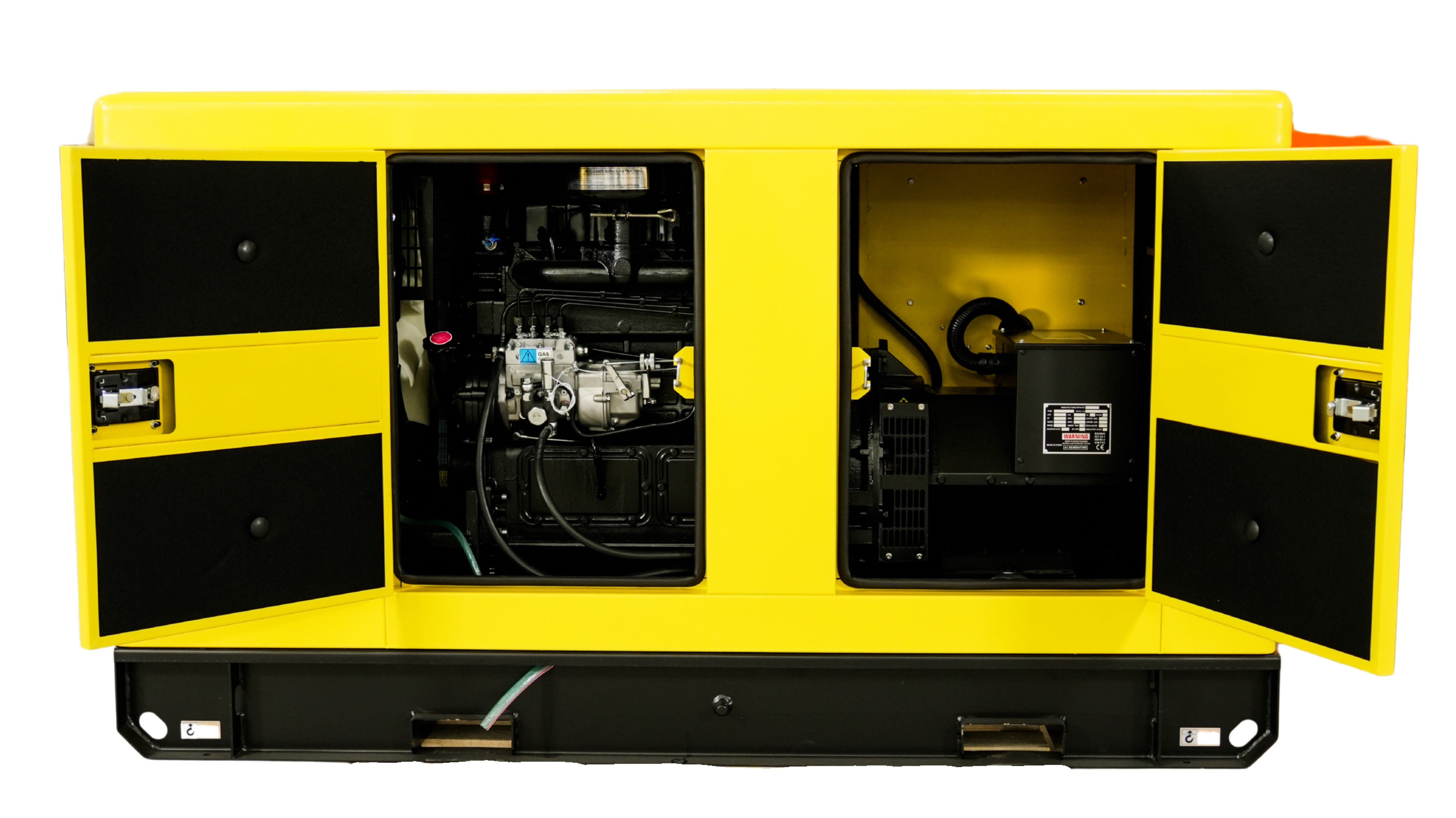 Der Generator liefert eine Ausgangsspannung von 400V / 38A und wird mit Dieselkraftstoff betrieben. Der 70-Liter-Tank sorgt für eine Betriebszeit von bis zu 8,5 Stunden bei 75 % Auslastung.
