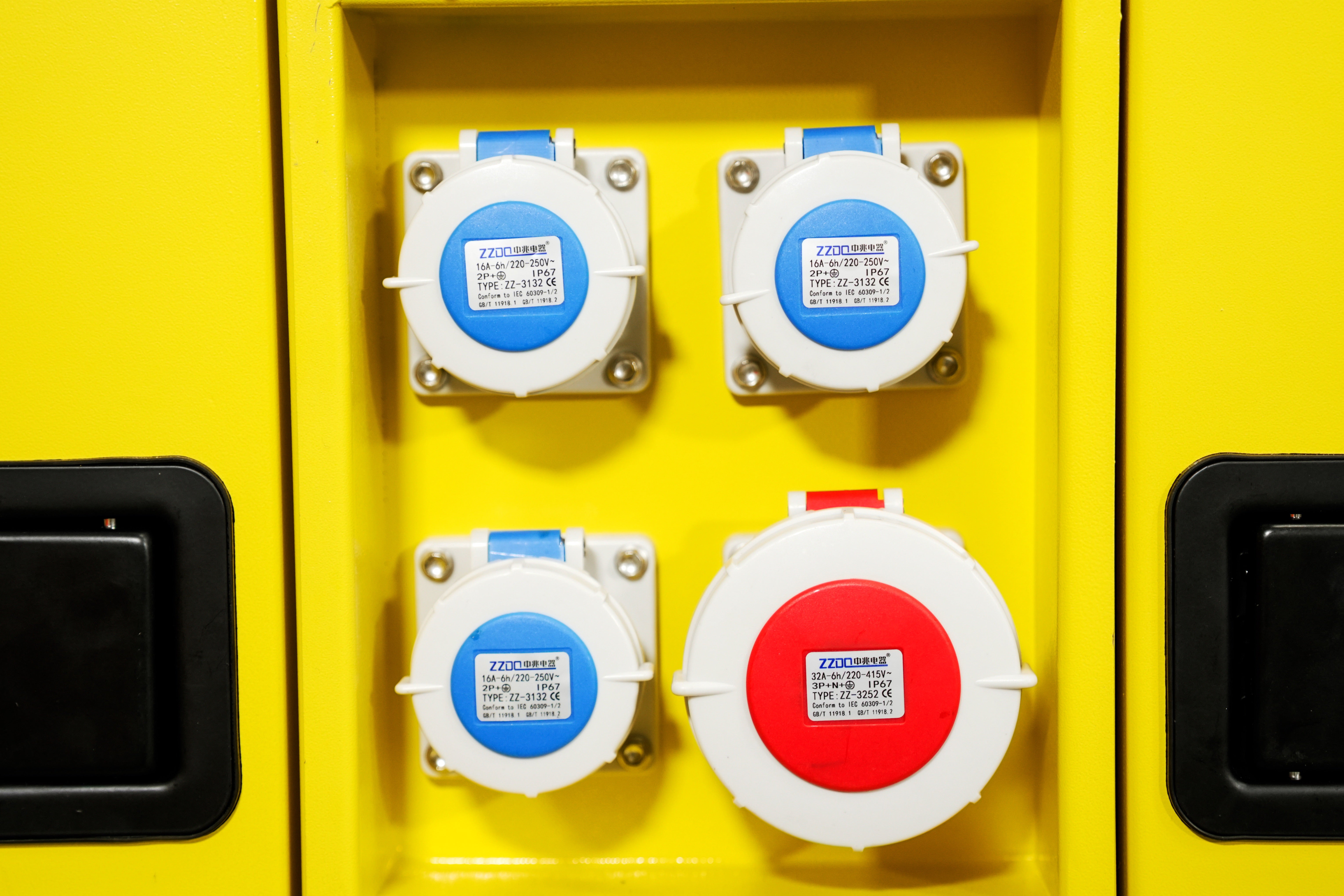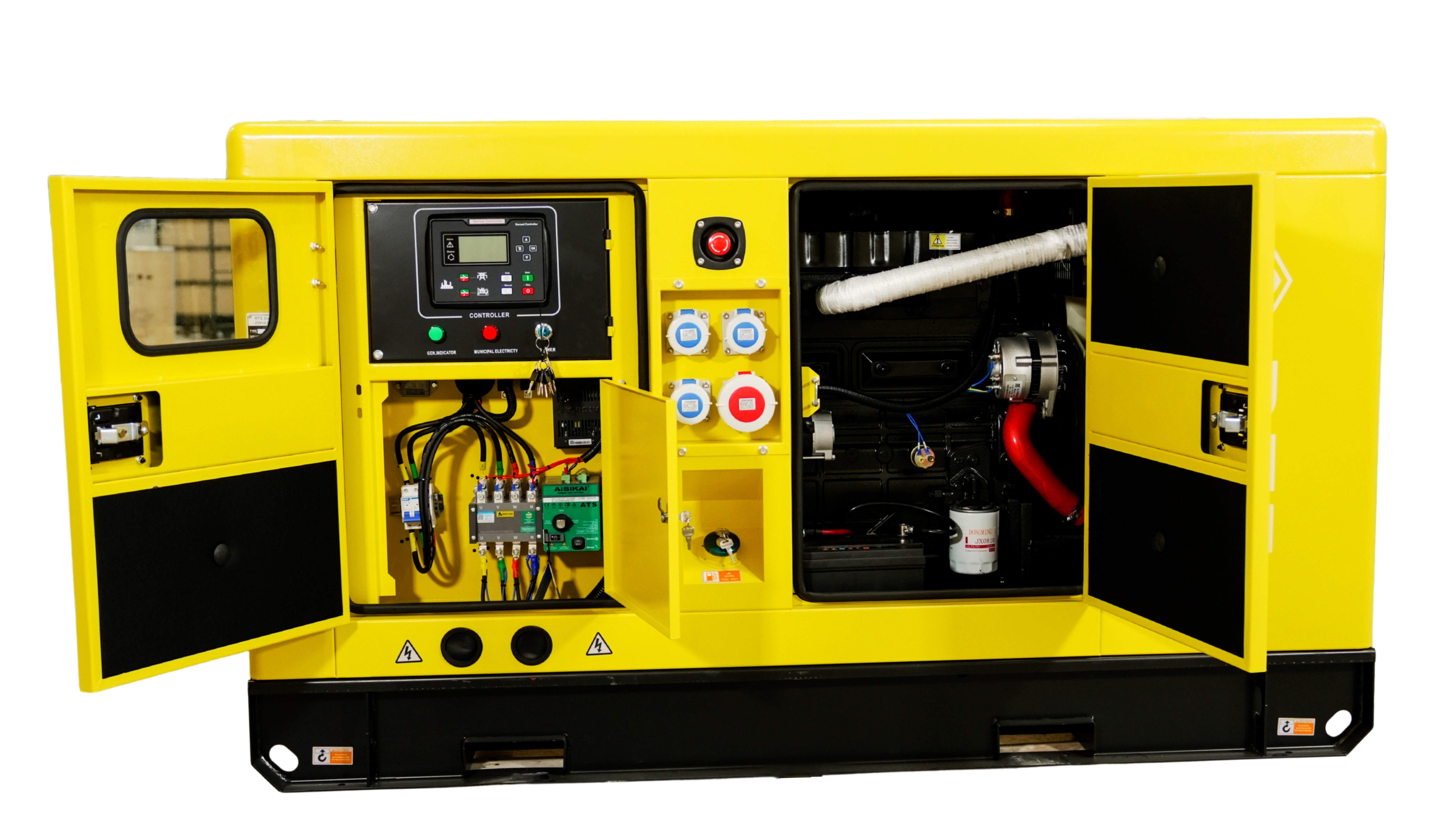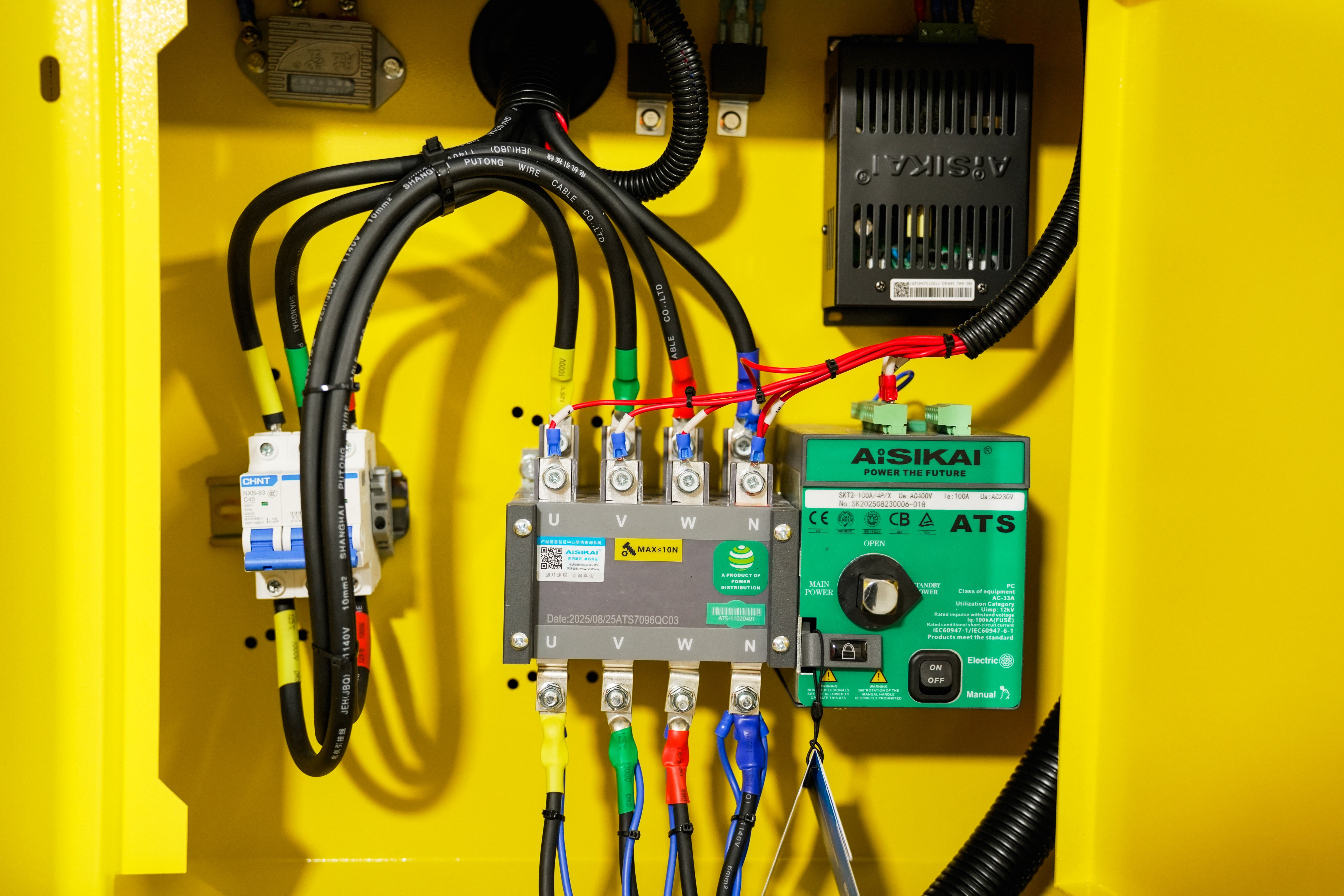 Die Anschlussmöglichkeiten sind vielseitig: Der Generator ist mit vier Steckdosen in zwei Größen ausgestattet (3 × 16A, 1 × 32A) für die 400V- und 230V-Stromabgabe. Zusätzlich ist bereits ein ATS-Modul (Automatic Transfer Switch) verbaut, das eine nahtlose Integration in bestehende Stromnetze erlaubt. So wird bei Stromausfall automatisch auf Generatorbetrieb umgeschaltet – für eine unterbrechungsfreie Versorgung.