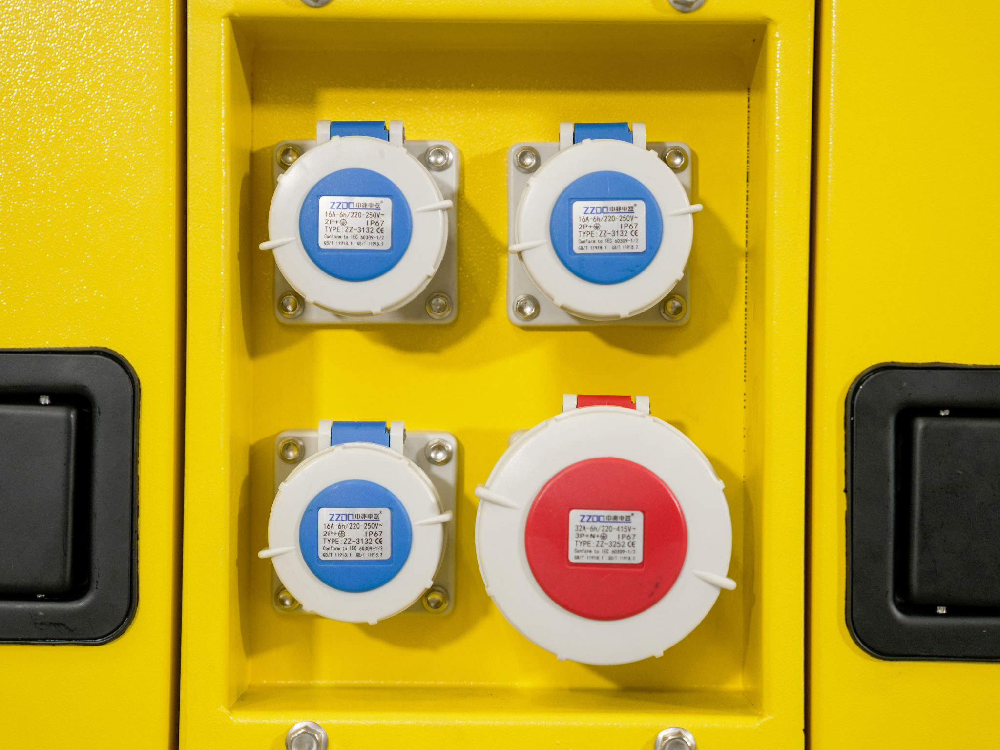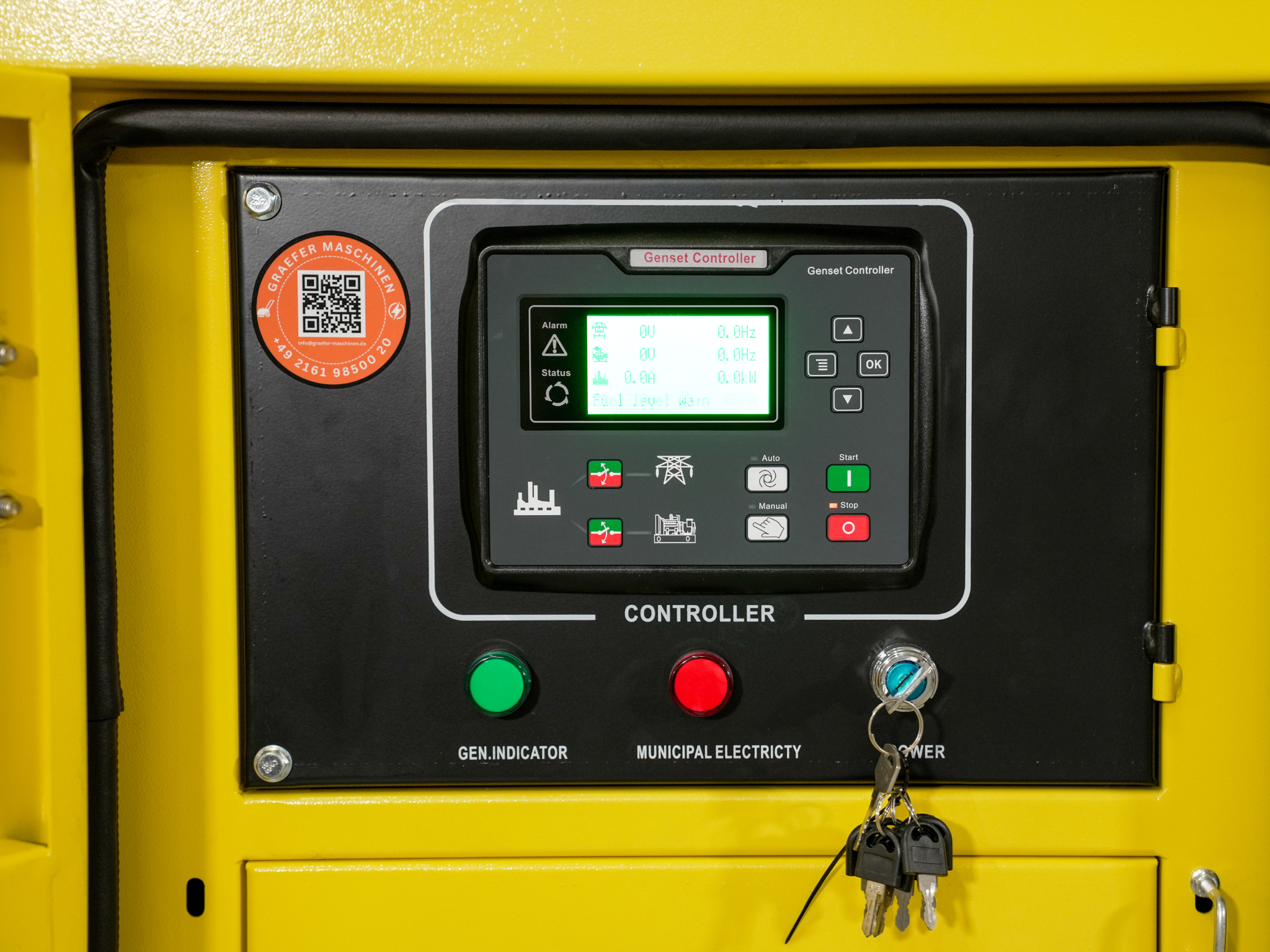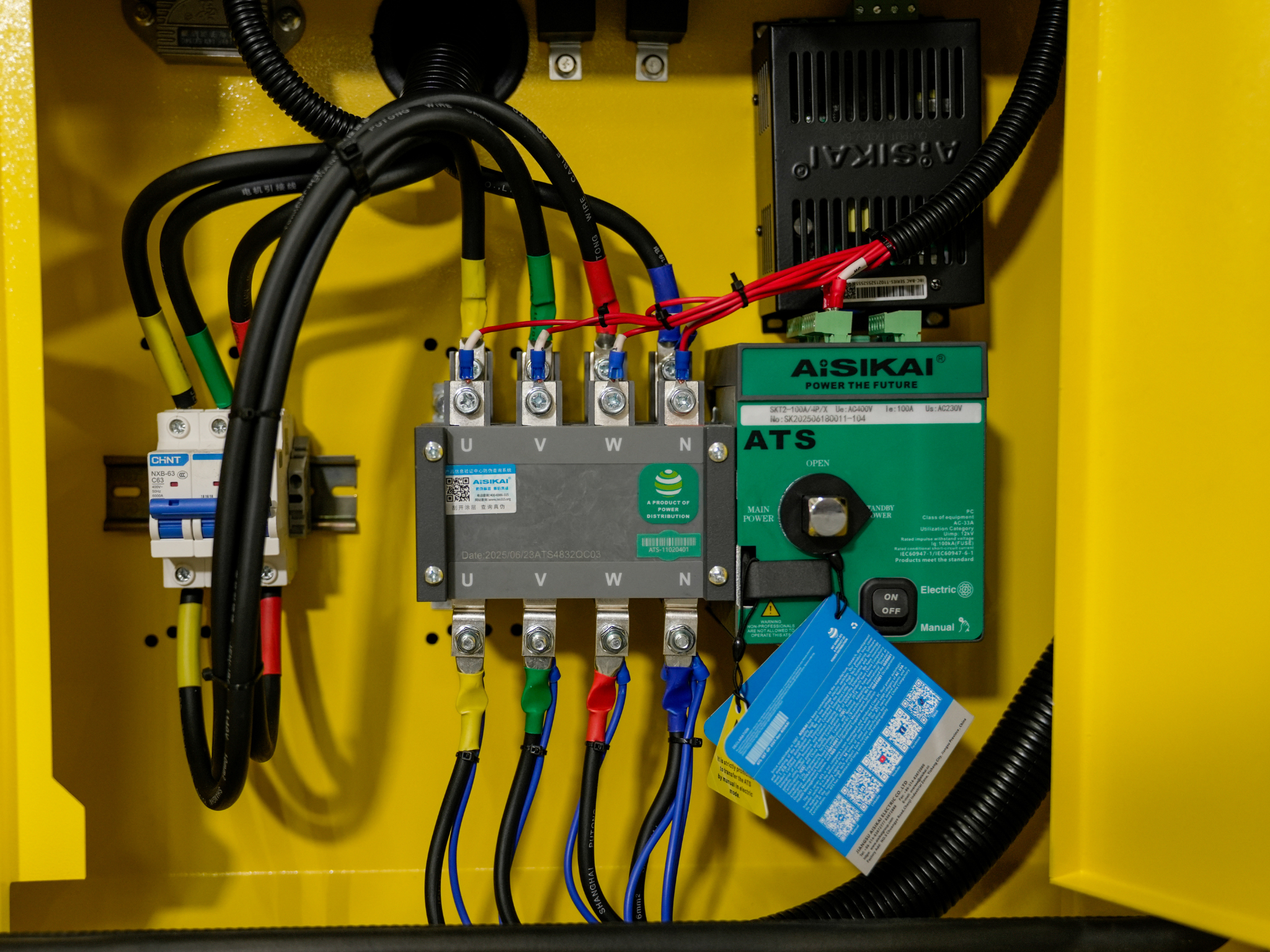 Die Anschlussmöglichkeiten sind vielseitig: Der Generator ist mit vier Steckdosen in zwei Größen ausgestattet (3 × 16A, 1 × 32A) für die 400V- und 230V-Stromabgabe. Zusätzlich ist bereits ein ATS-Modul (Automatic Transfer Switch) verbaut, das eine nahtlose Integration in bestehende Stromnetze erlaubt. So wird bei Stromausfall automatisch auf Generatorbetrieb umgeschaltet – für eine unterbrechungsfreie Versorgung.