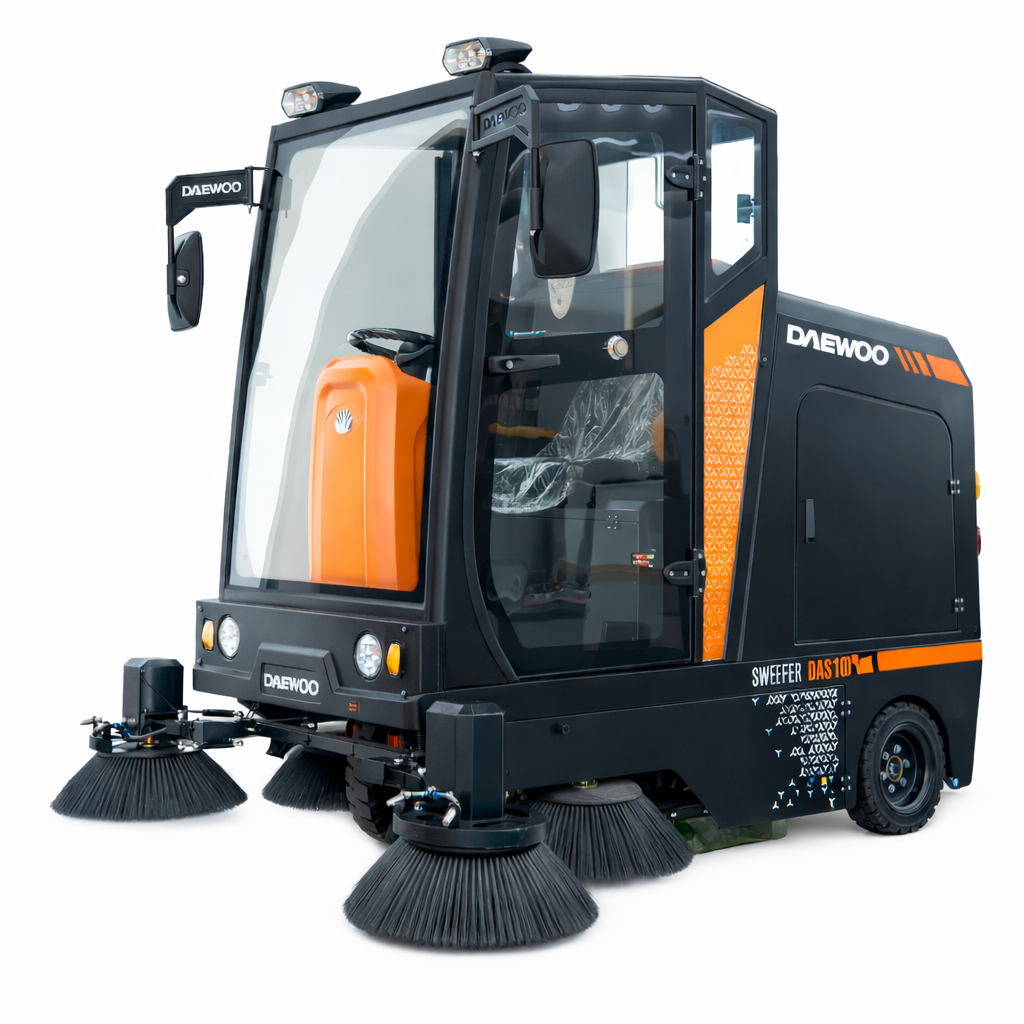 Följande erbjuds: batteridriven sopmaskin med hytt DAS100 av märket Daewoo. Med sin imponerande Ytkapacitet på 12 000 m²/h Det säkerställer snabb och effektiv rengöring av en mängd olika föremål. Hårda golvytor såsom Parkeringsplatser, asfalterade företagslokaler eller jordbruksanläggningar.